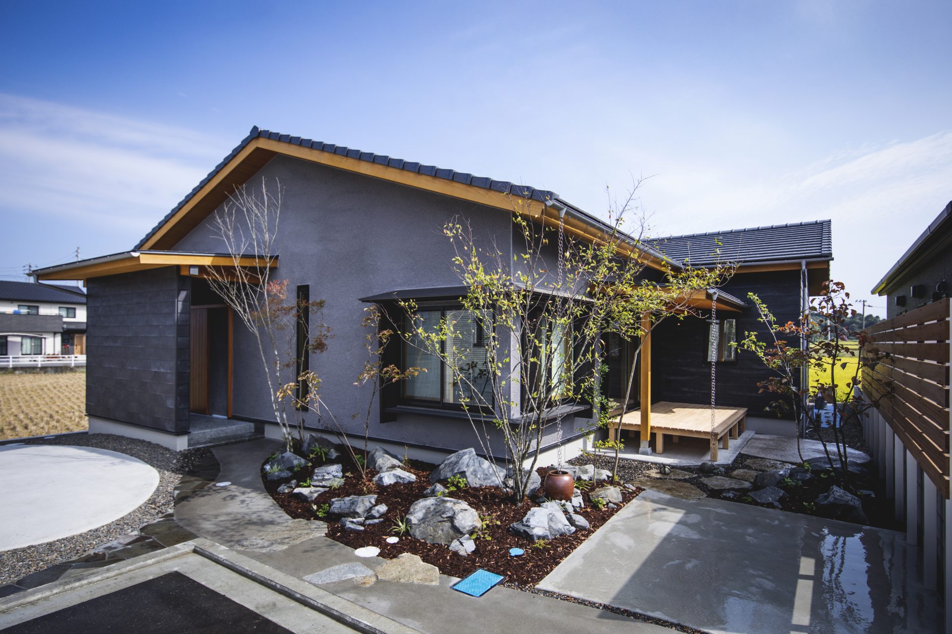 リビング、デッキ、和室にホール、家族それぞれが好きな場所を見つけて居処とできる、家のどこにいても家族の気配を感じられる平屋です。